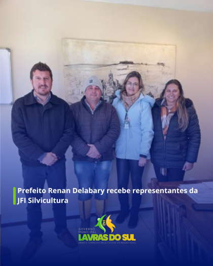 Na manhã desta quarta-feira, 02 de julho, o Prefeito de Lavras do Sul, Renan Delabary, e a Secretária de Administração, Daniele Moreira, receberam no gabinete os representantes da empresa JFI Silvicultura, Sr. Vicente da Costa Fonseca e Sra. Daiane Adolfo