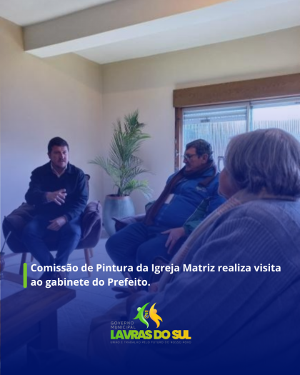 Na manhã de ontem, quinta-feira (03/07), o Prefeito de Lavras do Sul, Renan Delabary, e o Secretário de Turismo, Cultura e Desenvolvimento Econômico, Paulo Sérgio Corrêa, receberam em seu gabinete os integrantes da Comissão de Pintura da Igreja Matriz.